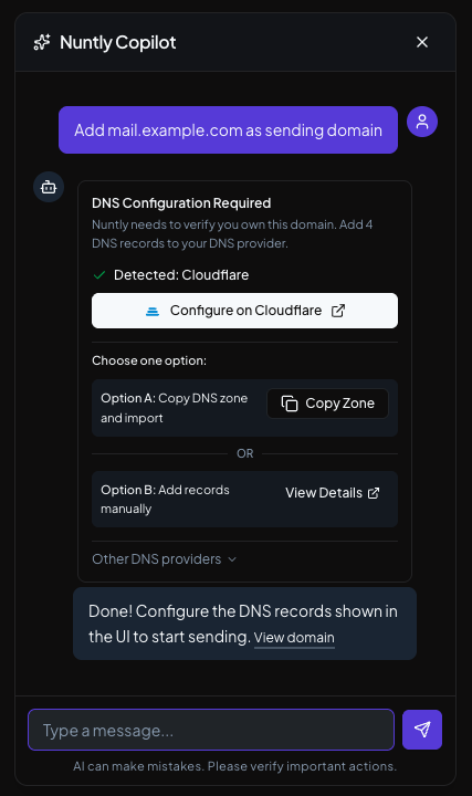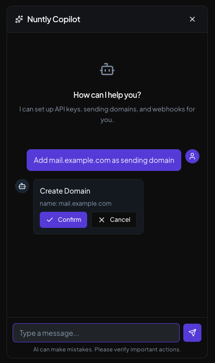 Try Nuntly Copilot and configure domains, API keys, and webhooks through natural conversation.