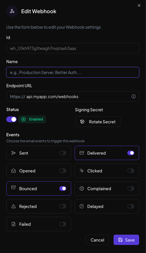Set up webhooks for delivery and bounce events to "https://api.myapp.com/webhooks"
