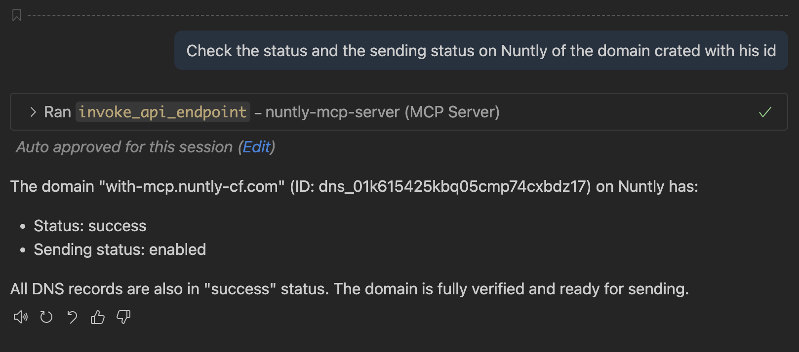 Everything is working as expected, let's create a sending domain in Nuntly and automatically set up the required DNS records in Cloudflare using natural language: