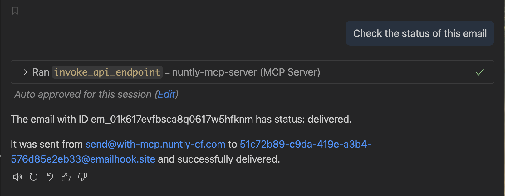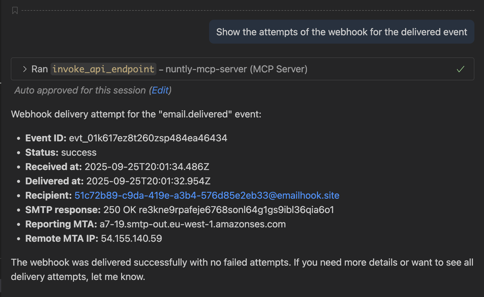 Nuntly’s MCP Server is a powerful tool that enhances the developer experience by allowing natural language interactions with Nuntly’s platform. By integrating with Cloudflare’s MCP Server, we streamlined the domain creation process, reducing domain setup by 95% and eliminating DNS copy/paste errors. This approach not only simplifies onboarding but also empowers developers to manage their email stack efficiently using their favorite AI clients.