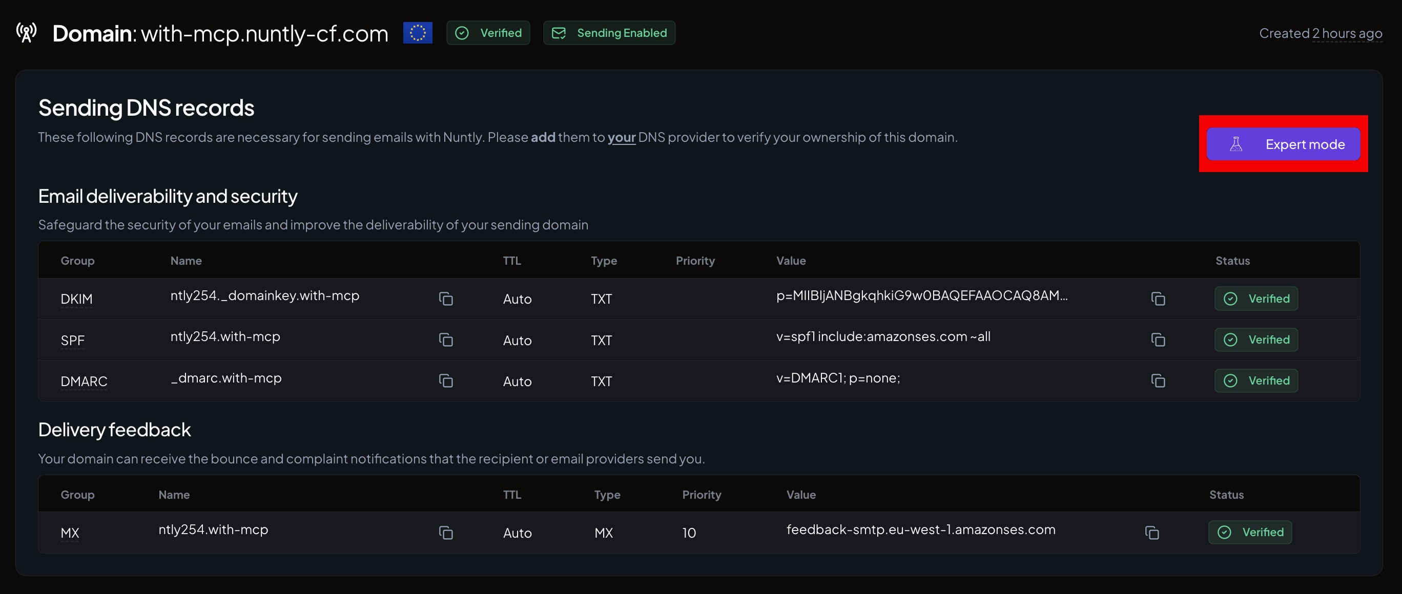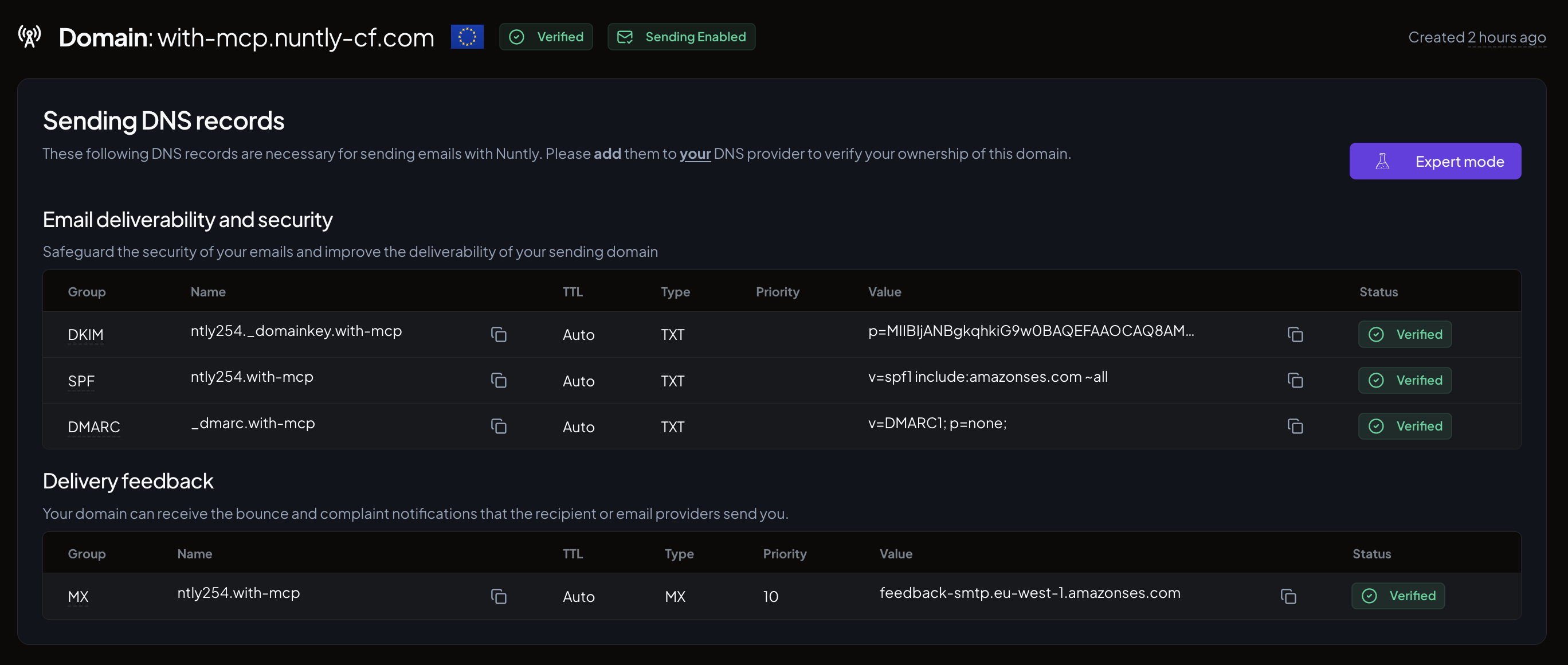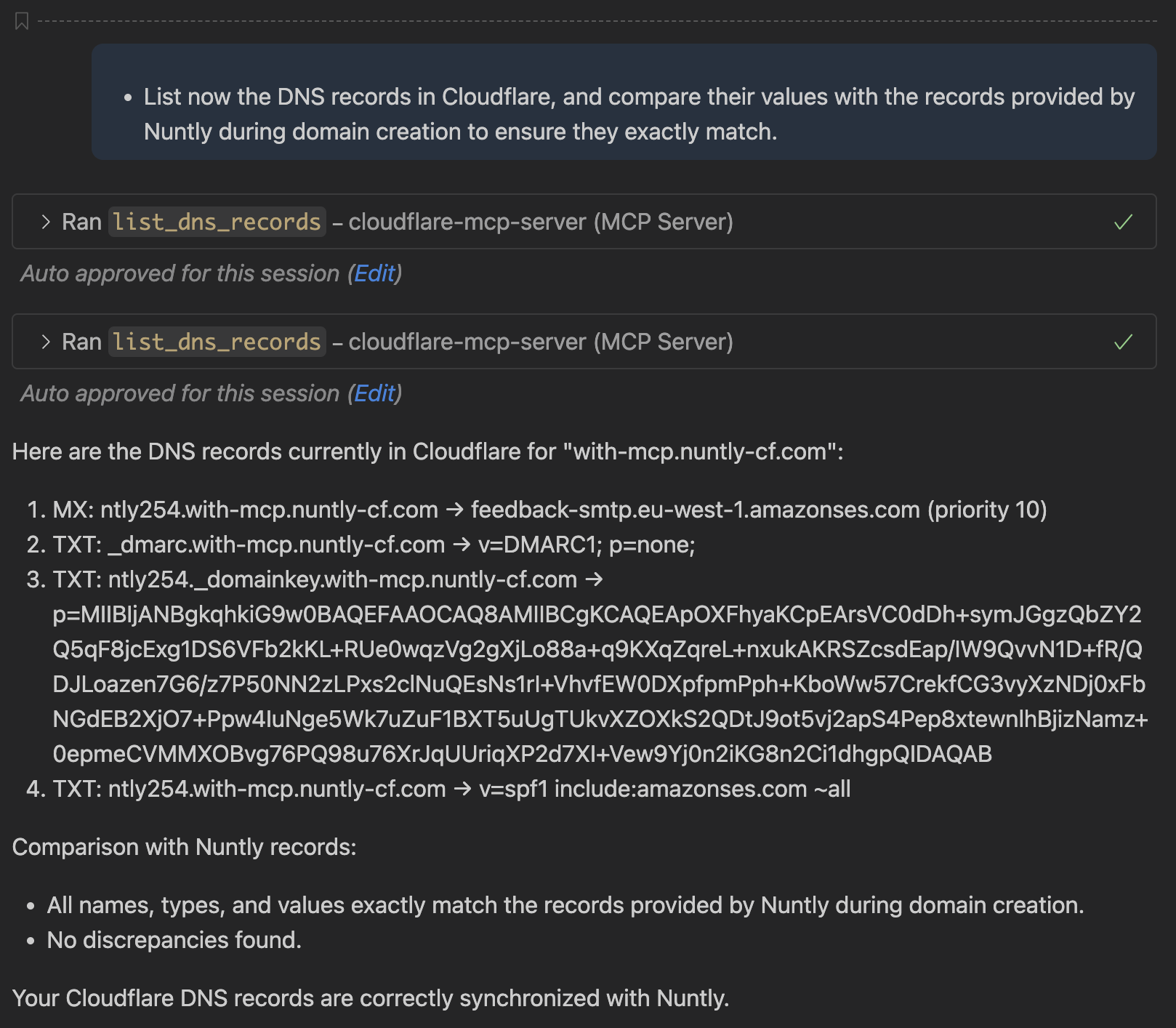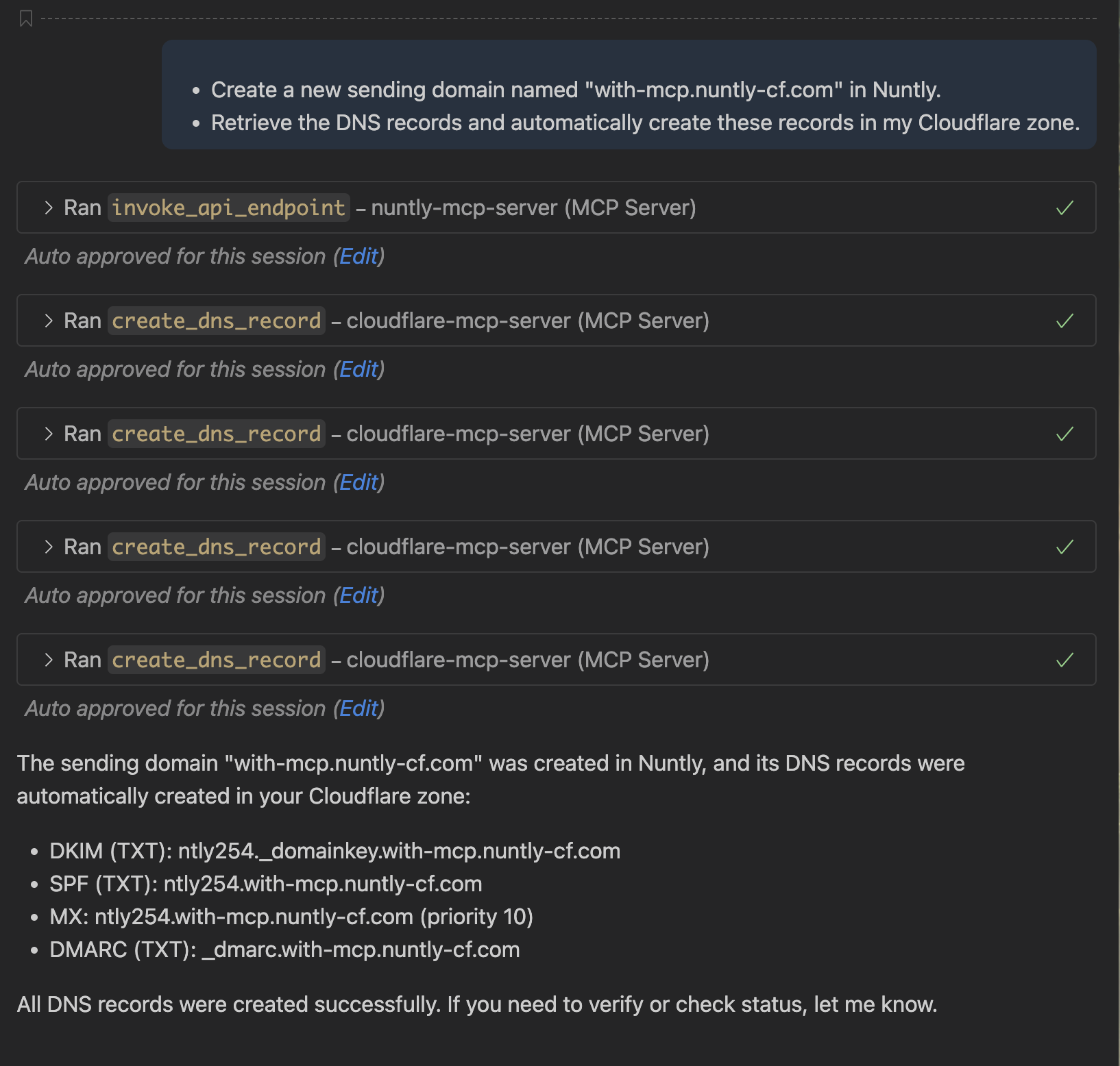 Yes you read it right, we just created a sending domain in Nuntly and all the required DNS records in Cloudflare in one single step, using natural language.