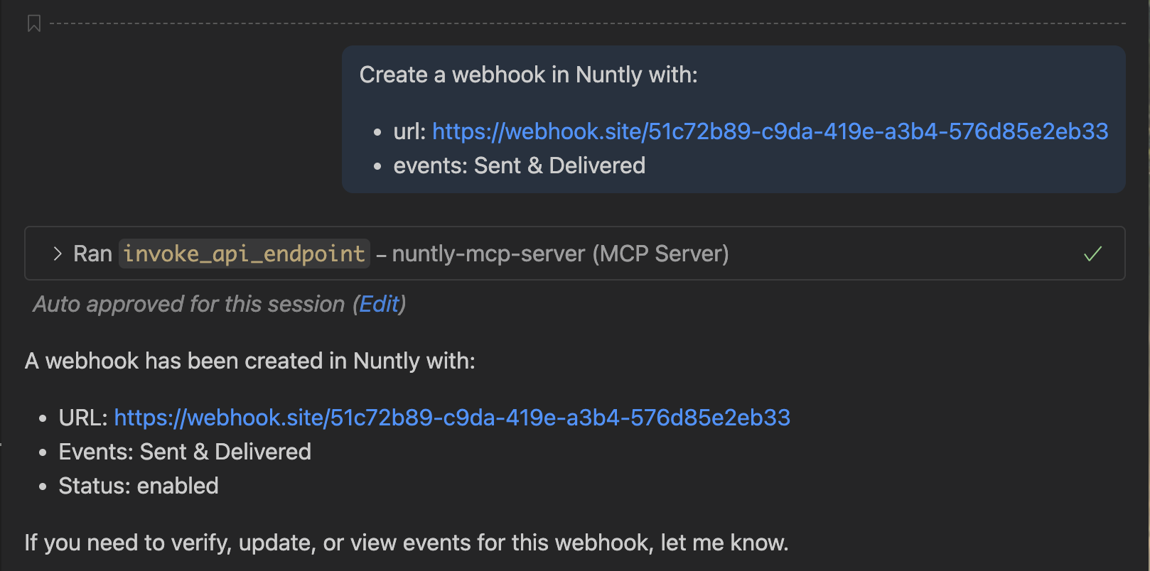 The goal here is to create a webhook in Nuntly and replay webhook event notifications using natural language. Let's create a webhook in Nuntly to receive event notifications for email sent and deliveries.
