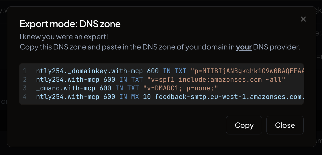 At Nuntly, we wanted to make this process as seamless as possible, so we introduced an Export Mode that simplifies the creation of all DNS records in a DNS zone format.