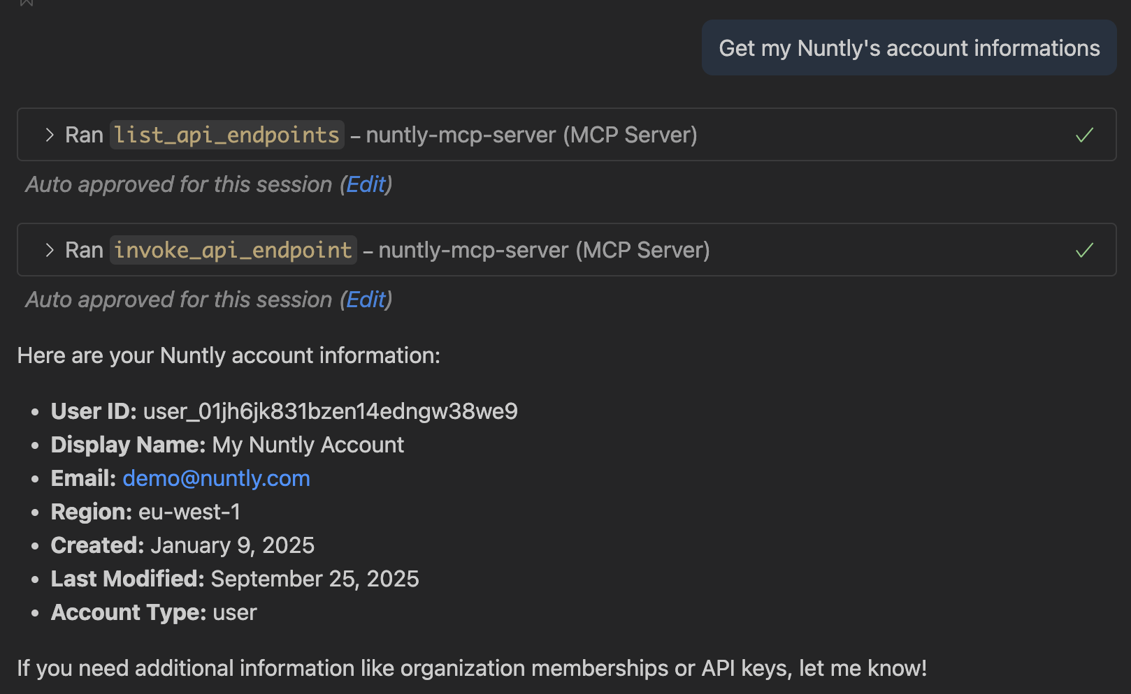 Check if everything is working by asking Github Copilot to get your Nuntly account information: