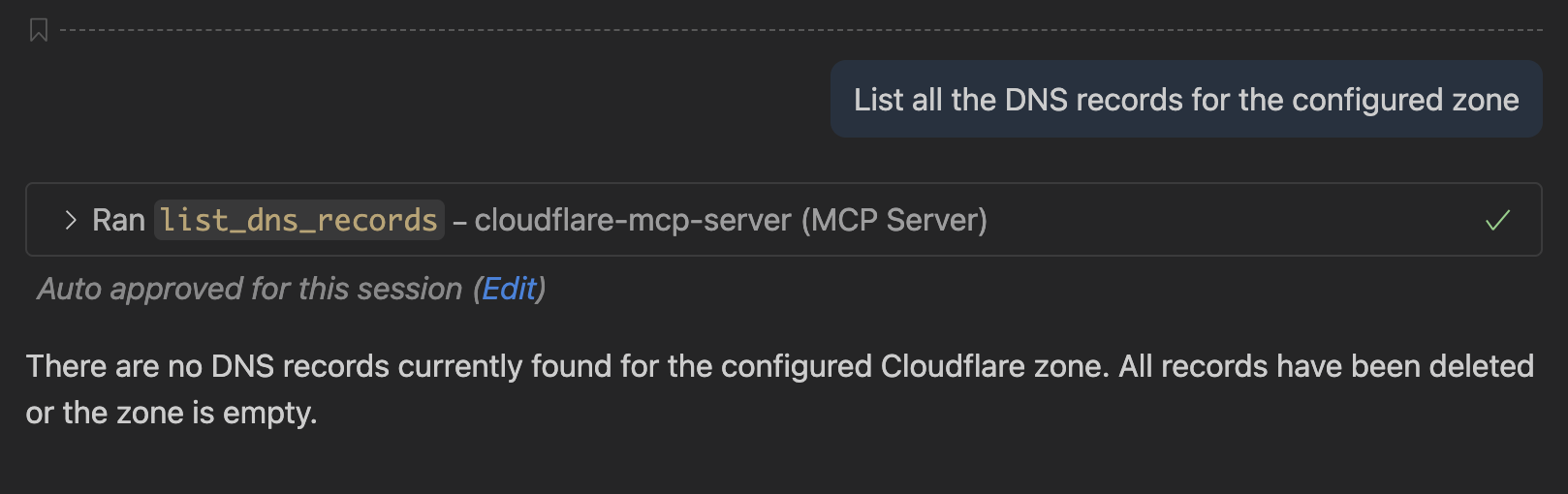 To be sure that the Cloudflare MCP Server is working too, let's start list the DNS records of your domain: