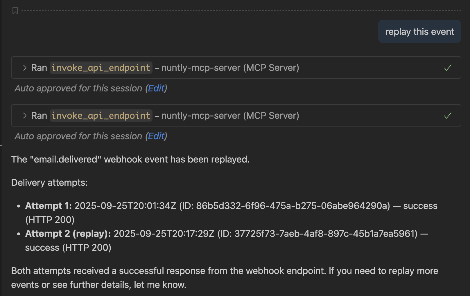 With Nuntly’s MCP Server, developers can use AI clients to describe tasks—such as configuring sending domains, creating webhooks, or replaying webhook event notifications—in plain language. The MCP Server interprets these requests and translates them into actionable API calls, making development faster, more intuitive, and accessible to everyone.